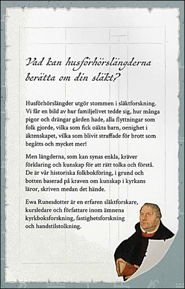 Den här boken är en praktisk guide till fastighetsforskning. Du får hjälp att hitta information i de vanligaste källorna, med särskilt fokus på digitalt tillgängliga arkiv som du kan nå direkt. Dessutom får du tips om andra spännande källor att utforska.